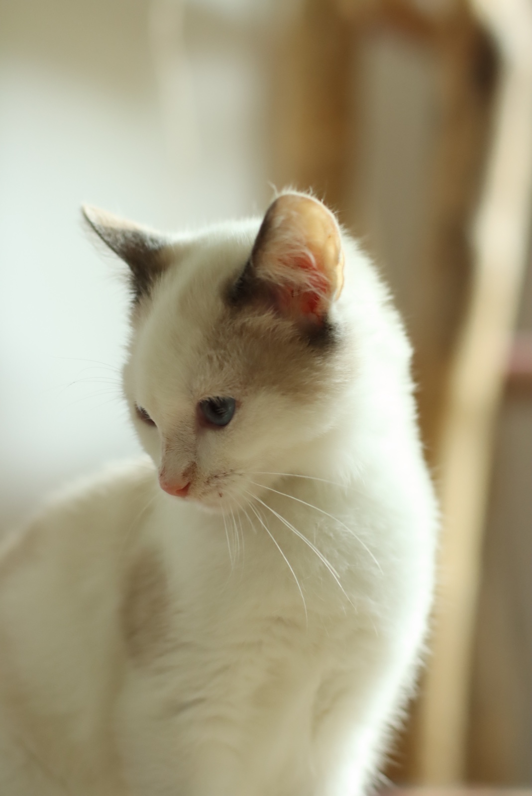 Athéna est sourde, mais cela ne l’empêche pas d’être une minette sociable, affectueuse et pleine de vie. Elle adore se blottir sur les genoux pour des siestes et profiter de longues séances de câlins. Curieuse et joueuse, elle explore tout ce qui l’entoure avec émerveillement et aime observer le monde avec attention.
